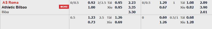 • Mức kèo nhà cái cược chấp trận này: AS Roma chấp 0,25 trái. AS Roma ăn 0,92. Ath Bilbao ăn 1,00