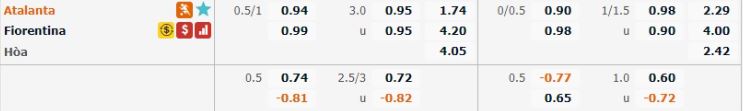 • Mức kèo nhà cái cược chấp trận này: Atalanta chấp 0,75 trái. Atalanta ăn 0,94. Fiorentina ăn 0,99