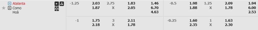 • Mức kèo nhà cái cược chấp trận này: Atalanta chấp 1,25 Trái. Atalanta ăn 1,03. Como ăn 0,87