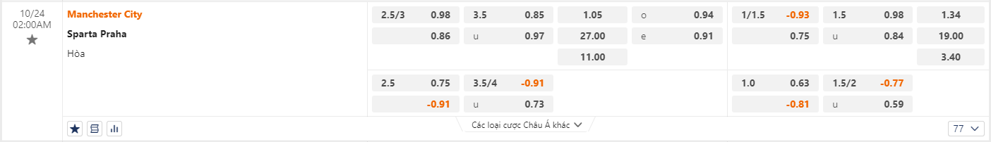 Tỷ lệ kèo bóng đá Manchester City vs Sparta Prague – 02h00 – 24/10/2024