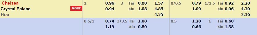 - Mức kèo nhà cái cược chấp trận này: Chelsea chấp 1 Trái. Chelsea ăn 0,96. Crystal ăn 0,94