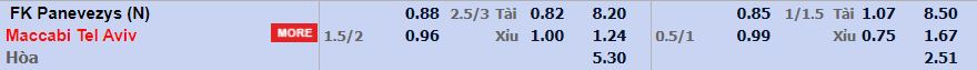 • Mức kèo nhà cái cược chấp trận này: Maccabi Tel Aviv chấp 1,75 trái. Panevezys ăn 0,88. Maccabi Tel Aviv ăn 0,96