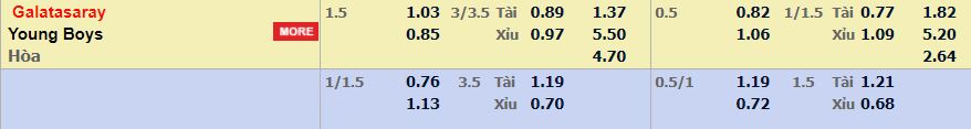- Mức kèo nhà cái cược chấp trận này: Galatasaray chấp 1,5 Trái. Galatasaray ăn 1,03. Young Boys ăn 0,85