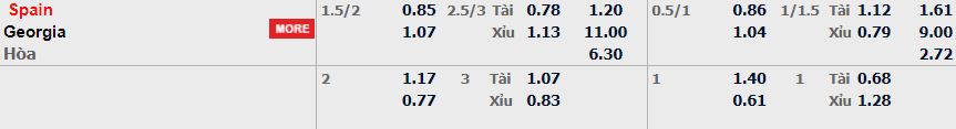 - Mức kèo nhà cái cược chấp trận này: Tây Ban Nha chấp 1,75 trái. Tây Ban Nha ăn 0,85. Georgia ăn 1,07