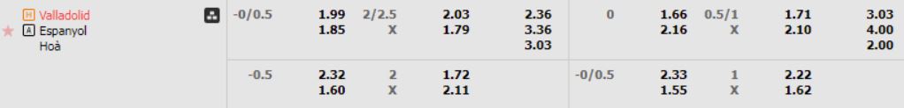 • Mức kèo nhà cái cược chấp trận này: Valladolid chấp 0,25 trái. Valladolid ăn 0,99. Espanyol ăn 0,85