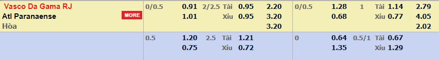 - Mức kèo nhà cái cược chấp trận này: Vasco chấp 0,25 trái. Vasco ăn 0,91. Atl Pr ăn 1,01